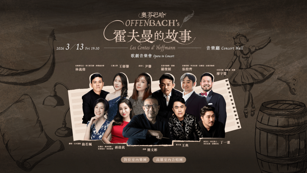 今年 3 月,衛武營將演出《霍夫曼的故事》歌劇音樂會,除了衛武營總監簡文彬親自指揮,還可以聽見對位室內樂團與高雄室內合唱團的精彩演出,輔以一眾國內聲樂家,將畢生積累的唱功灌注進歌劇曲目裡,創造難忘的星期五夜晚。