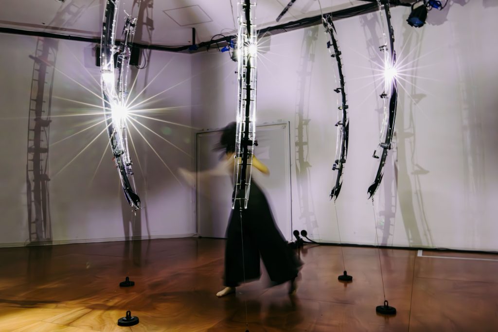 音像藝術兩組學員此次呈現皆加入現場表演,藉由表演者的引導,帶觀眾融入創作者所建構的世界觀。擁有豐富策展經驗的導師蔡宏賢,著重以觀眾的角度出發審視作品,協助學員看見作品中的盲點,拉近觀眾與作品距離。何芯源、何書賢的作品《月偏蝕》,透過光影與聲響的變化重塑觀眾對於空間的感知,在作品中表演者化身祭司,在裝置間穿梭執行神秘的儀式,演繹現代人對未知技術的依賴與恐懼,展現人與技術之間的互動與拉扯。由李昀儒與雅妮共同發展的《暗場迴圈》,以凝視、鏡頭、展演作為創作的架構,邀請觀眾跟著「派對常客」踏入一場被鏡頭凝視的派對,親身體驗處在一個一舉一動都被監視著的環境,是否還能恣意地狂歡。