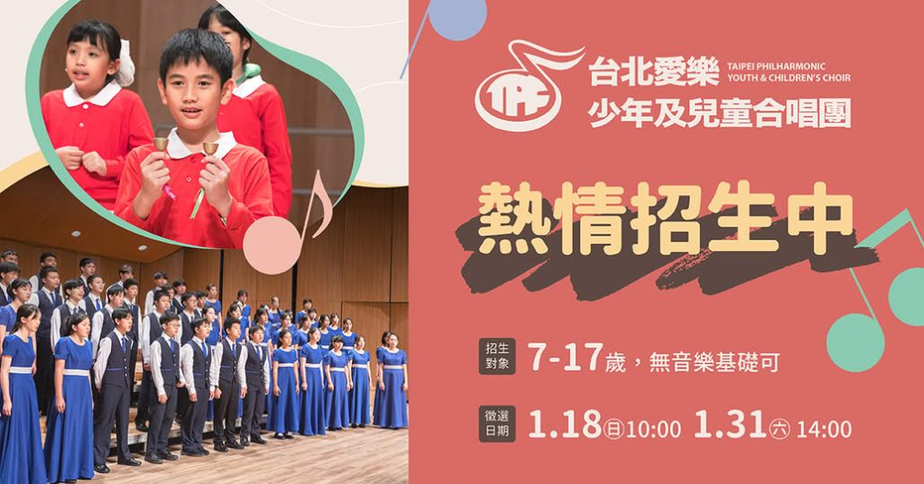 即日起,歡迎更多孩子加入這段充滿音樂與成長的旅程——台北愛樂少年及兒童合唱團開放新團員招募,邀請對歌唱有興趣、年滿 7 至 17 歲的孩子報名參加。無需音樂基礎,只要對音樂懷抱熱情,我們都期待看見你的笑容與聲音!本次甄選將於 1 月 31 日舉行,內容包含聽音、視唱與音域測試,協助了解每位孩子的潛力並安排適合的班級。讓孩子在音樂中找到自信與方向,從歌聲啟程,開啟一段難忘的童年記憶。