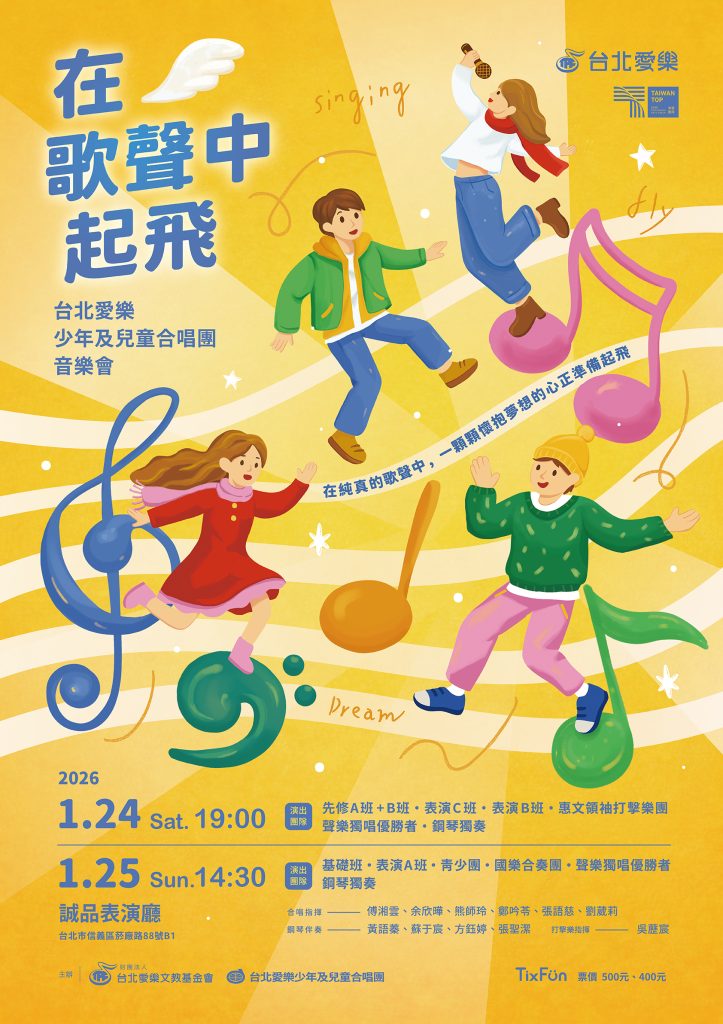 「在歌聲中起飛」——台北愛樂少年及兒童合唱團年度音樂會,將於 1 月 24 日(六)與 1 月 25 日(日) 在誠品表演廳溫馨登場。來自不同年齡與學習階段的孩子們,將以純淨歌聲與自信身影,帶領觀眾走進屬於童聲的音樂世界。本次音樂會集結合唱、鋼琴獨奏、聲樂獨唱及打擊樂演出,透過多元編制與豐富曲目,展現孩子們在學習歷程中的成長軌跡——從初學的勇敢嘗試,到站上舞台綻放光芒,每一道歌聲,都是向夢想起飛的重要一步。節目詳情請洽 TIXFUN 售票系統。